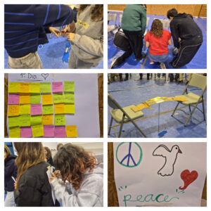 Foram colocadas no dia 28 de janeiro, a culminar a quinzena dedicada à paz e à não violência. São mãos de alunos com palavras como lealdade, amizade, amor, esperança, sorte… Muito do que nós queremos ver no mundo. Podemos encontrá-las à entrada para o bloco A.